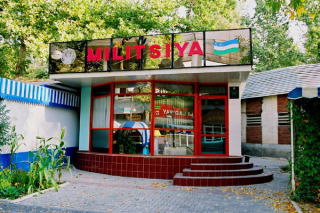 ブロードウェイは若者であふれ、露店やオープンカフェなど、とてもにぎやか。そして、ガイド通り警官が目を光らせパトロールしている。しばらく歩くと、1人の警官がこっちに近づいてきた。イヤな予感。来たー!やばいぞ、うわさのワイロ要求か・・・最初に挨拶がわりの握手。いつ来た?ウズベキスタンはいい国か?とか質問されたあとでパスポートチェック。ホテルに置いてある、と言うと顔を曇らせそれは困るな〜、ちょっとこっちまで来てくれないかなあ、とか言いながら交番のようなところに連行される。(右写真)